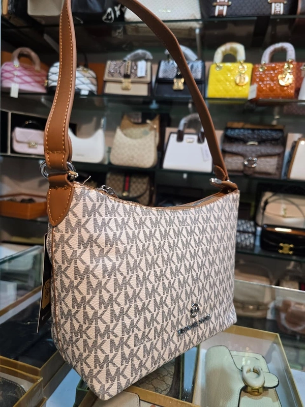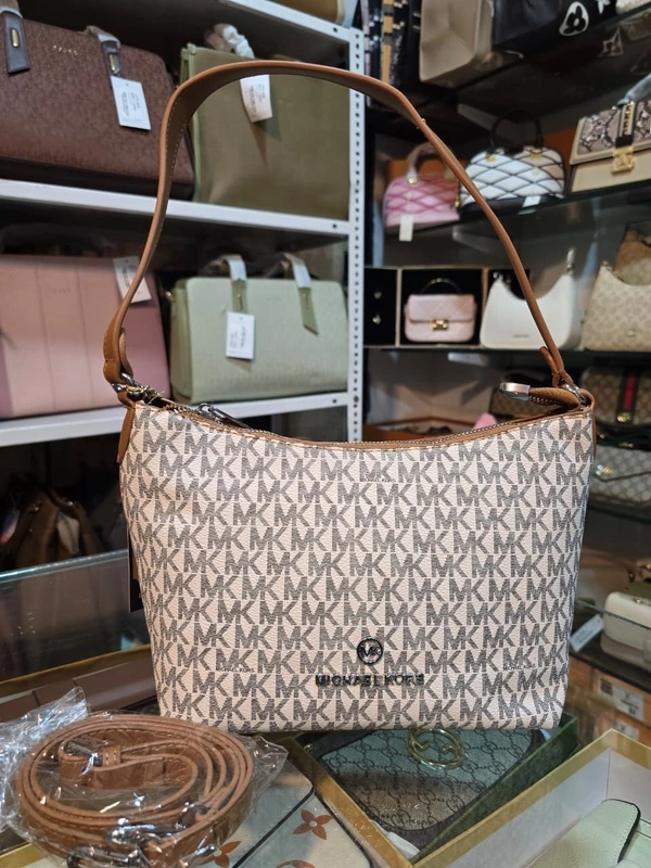 Apne style ko elevate karein is classy Michael Kors MK Signature Bag ke saath. Elegant vanilla base par all-over MK monogram print aur tan leather strap is bag ko timeless luxury look deta hai. Front par Michael Kors logo detailing iski premium appeal ko highlight karti hai.